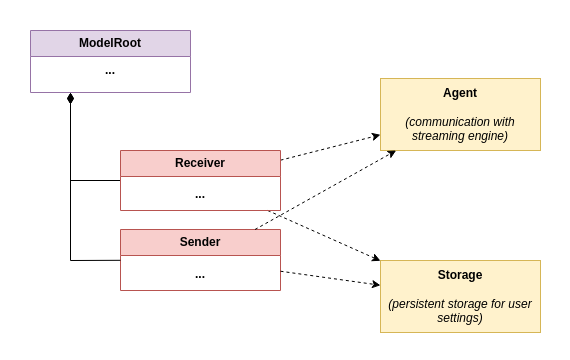 We also have dto package, which contains common data transfer objects - plain data types without any behavior. These DTOs are widely used in the code: for example, SenderConfig is used by Sender model (in private fields), Storage (to read/write config), and Agent (to enable streaming).